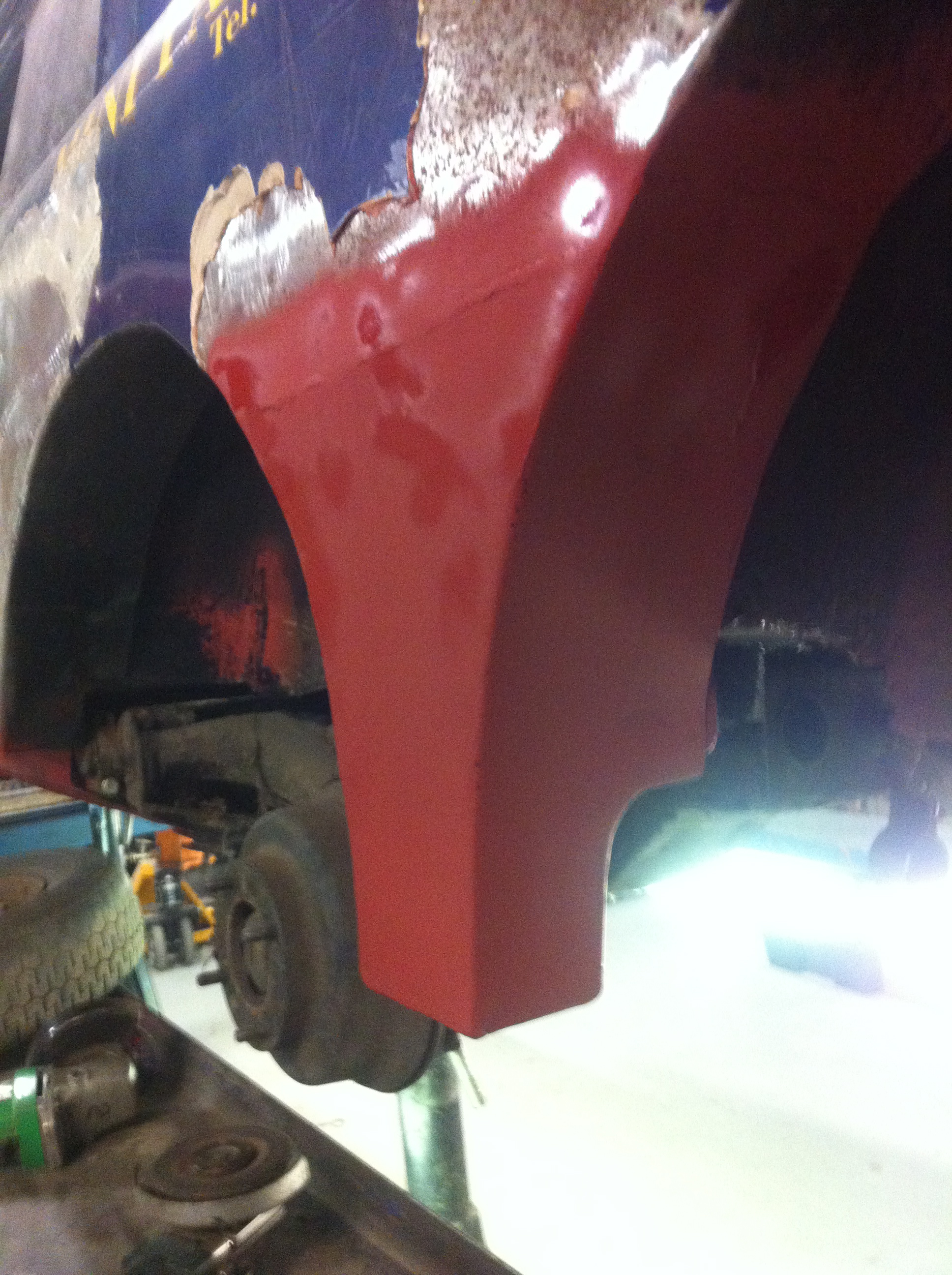 Voor opdrachtgever hebben we hem voorzien van een nieuwe vloer, nieuwe neus, hebben we de ophanging achter sterk aangepast ivm het 6 wieler gedeelte en op diverse plaatsen kunst en vliegwerk