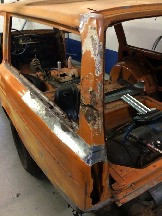Met als gevolg dat we hem hebben gestript tot op de wielen met de motor er nog in, dorpels, vloeren, stijlen en reservewiel bakken achter vervangen. Oude schade opgelost in de stijl achter en de hele auto binnen en buiten van een nieuwe laklaag voorzien..